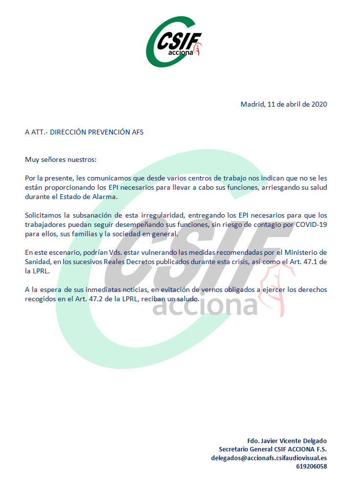 Estimados Compañeros: Os Adjuntamos la carta enviada a los servicios de prevención de la empresa.CARTA PREVENCION