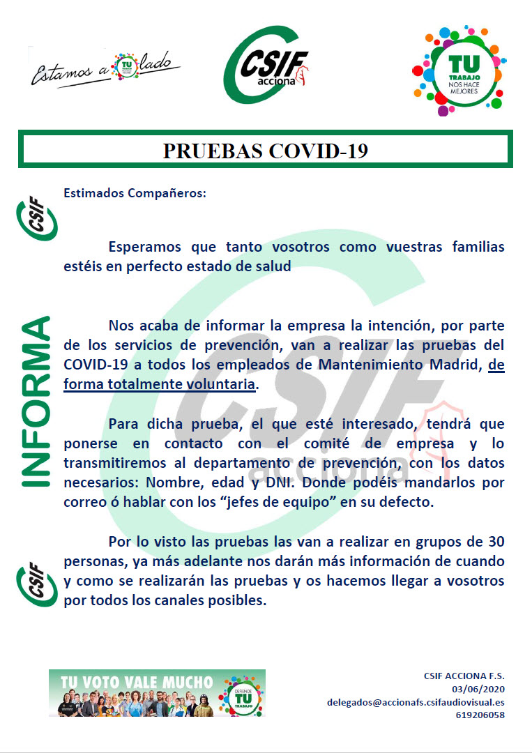 Os Adjuntamos un comunicado sobre las pruebas del COVID-19 a los empleados de AFS Mantenimiento Madrid. covid 19 pruebas